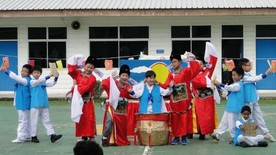 Meskipun sederhana dan hanya berlangsung selama 1 jam, acara perayaan musim gugur yang diadakan di sekolahnya Cinta cukup seru dan menyenangkan. Tepat jam 7.30, murid-murid dan guru-guru sudah duduk manis di lapangan sekolah, sementara orangtua yang datang berdiri di selasar depan kelas. Acara dibuka dengan sambutan dan cerita tentang mooncake festival yang (sayangnya) disampaikan dalam bahasa Cina (sehingga saya nggak ngerti sama sekali, hiks). Dilanjutkan dengan pertunjukan Chinese Drama yang juga berbahasa Cina (yaeyalaah, masa berbahasa Korea). Pada sesi ini, penampilan salah satu siswa lower primary mencuri perhatian penonton karena totalitas dan semangatnya memerankan seorang murid dari sebuah perguruan jaman dulu.